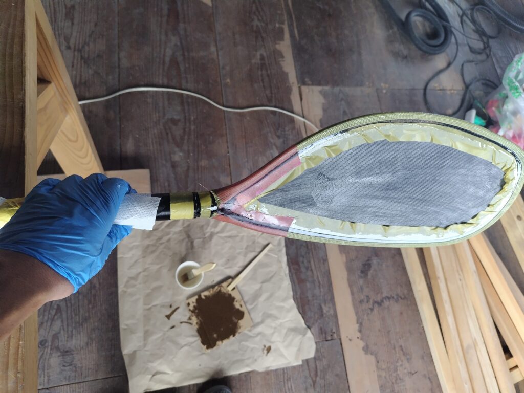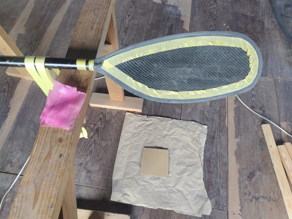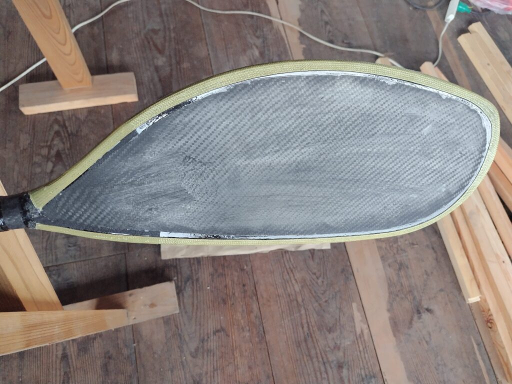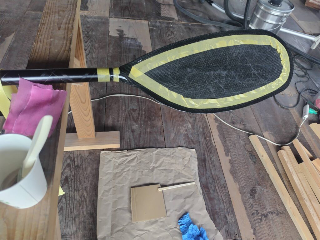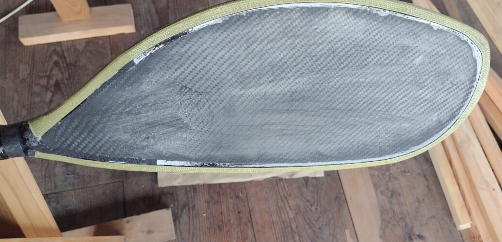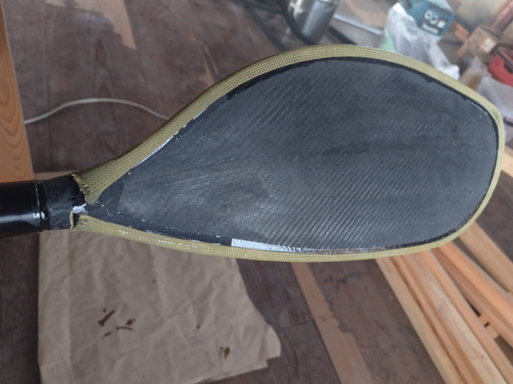 パドルのエッジ修理についての修理記録です。以前、エッジ修理について質問されたので、記録に残そうと思います。下記に出てきますが、通常であれば、両手が樹脂でべとべとになるので、記録を取る余裕がないのですが、頑張って記録しました。