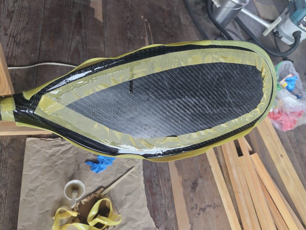 上記は、硬化後に、マスキングとピールプライを剥がした状態。ネックあたりの末端が汚いので、これをカッターで切り落としてきれいにします。